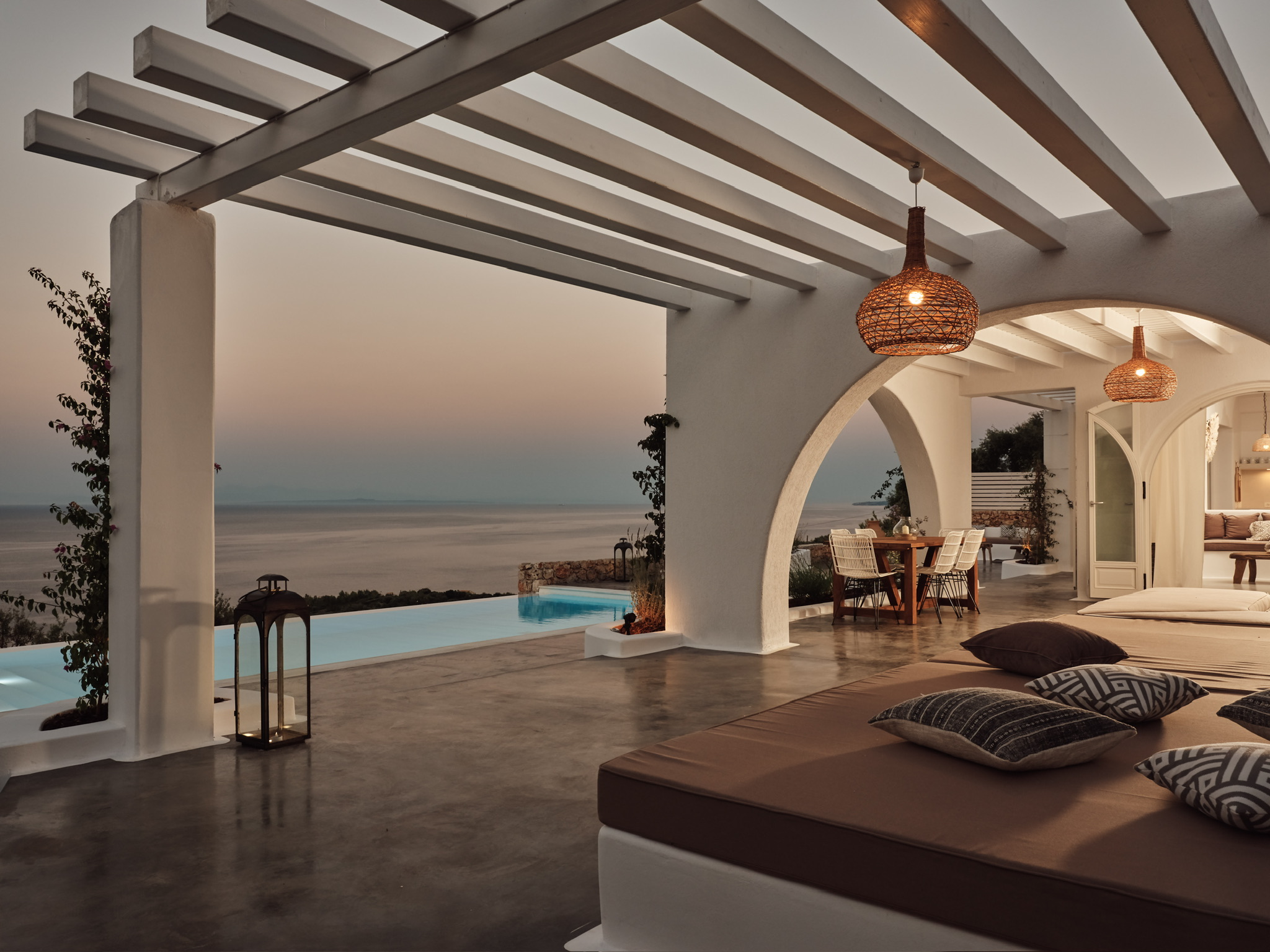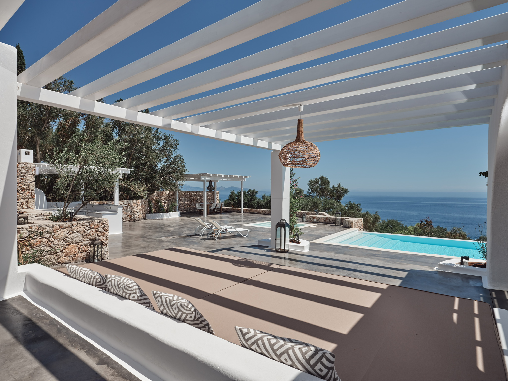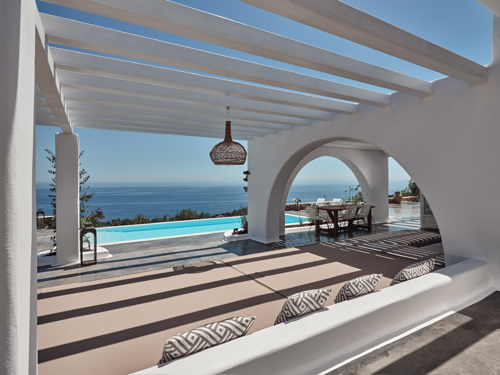 Villa Maia is a striking, design-led villa set in one of the most desirable locations in northern Zakynthos. This beautiful, contemporary property is within easy walking distance of the exclusive Peligoni Club and a short drive to the charming port of Agios Nikolaos- yet enjoys a wonderfully peaceful and private setting with far-reaching sea views. Designed around a striking glass atrium on entry, and wrapped by the C-shaped layout, Villa Maia is flooded with natural light and showcases an exquisite blend of contemporary Mediterranean architecture and relaxed luxury. Clean white arches, natural stone, soft textures and thoughtfully curated furnishings give the villa a calm, refined atmosphere throughout. Comfortably sleeping up to 6 guests across three spacious and tranquil bedrooms- each comprising of its own ensuite bathroom and terrace access, creating peaceful retreats for rest and relaxation. The bright, open-plan kitchen and living area form a central, light-filled space, where large folding glass doors open fully onto generous ocean-view terraces. These outdoor spaces are perfect for long, leisurely dinners, shaded lounging and soaking up the views throughout the day. The kitchen is fully equipped, and the living area includes a smart TV, perfect for relaxed evenings in. Villa Maia’s terraces and pool area are designed for effortless indoor-outdoor living, with jacuzzi pool, shaded pergolas, built-in seating, and stylish dining spaces that make the most of the villa’s exceptional setting overlooking the Ionian Sea. With its unique architecture, serene ambience and a convenient location, Villa Maia is an exceptional choice for families, friends or couples seeking a stylish and sophisticated escape in Zakynthos.